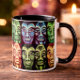 Striking mug featuring a bold pattern of Mayan-inspired tribal faces in rich, vibrant tones. This artistic design blends cultural influence with a modern aesthetic, creating a powerful and expressive statement piece.