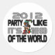 Colorful Mayan God in the center of a collage of grey & black words spelling phrase, “2012 Party Like It‘s The End of The World.” Perfect humor playing on the theory of the Mayan Calendar