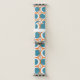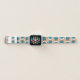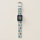 This Apple watch band has a mid-century modern design of open orange circles with solid teal circles running across the pattern with teal vertical lines and orange horizontal lines.