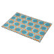 This cloth placemat has a mid-century modern design of open orange circles with solid teal circles running across the pattern with teal vertical lines and orange horizontal lines on a field of teal.