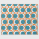This wrapping paper has a mid-century modern design of open orange circles with solid teal circles running across the pattern with teal vertical lines and orange horizontal lines.