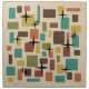 A simple 1950s abstract art design with rounded squares and rectangles in a disarrayed multicolored pattern.