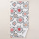 This towel set has a mid-century modern design of flowers made of circles in shades of pink, cranberry and beige and black lines.