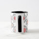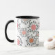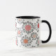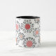 This mug has a mid-century modern design of flowers made of circles in shades of pink, cranberry and beige and black lines.