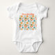 This baby bodysuit has a mid-century modern design of concentric circles in gold, orange, and turquoise on a white background.