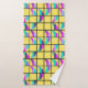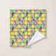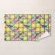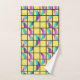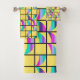 This towel set has a mid-century modern design of crescent moons divided horizontally into three colors, pink, blue, lavender, or seafoam, split in half and scattered on a grid with a yellow background. If you like the design but want different colors, message me.