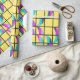 This wrapping paper has a mid-century modern design of crescent moons divided horizontally into three colors, pink, blue, lavender, or seafoam, split on half and scattered on a grid with a yellow background. If you like the design but want different colors, message me.