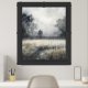 A modern, moody, misty meadow with trees and deep grasses. Framed print from a dry brush watercolor painting. Ethereal, minimalist. Black, white and a touch of brown. Watercolor washes with dry brush details. This is a print of a watercolor. Modern simple black frame. Choose your frame style and color.