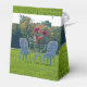 Convert this for any occasion. In the middle of the meadow sits a white antique-looking table with chairs. On top of the table is a flower pot with red flowers. In the background are the trees that are starting to change with the early fall.