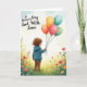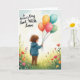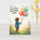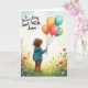 This card shows a small child standing with their back slightly turned in a sunlit meadow, as if pausing to take in a quiet, loving moment. The grassy field is lush and dotted with tiny wildflowers in pink, orange, and yellow, creating a gentle, romantic softness in the scene ❤️. The child wears a calm blue hooded top with brown trousers, and their relaxed posture suggests a tender offering meant for someone special. In one hand, they hold five pastel balloons—yellow, pink, teal, green, and orange—floating upward on thin strings like a sweet, shared secret. The sky above is softly washed with light tones, giving the whole setting an airy springtime feel 🌼. In the upper left corner, the message “A Mother’s Day Sent With Love” appears in a flowing, dark-colored lettering style. The text sits comfortably against the pale sky, leaving the child and balloons as the main focus. The balloons rise diagonally toward the top right, their rounded shapes lightly highlighted against the soft background.