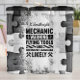 This graphic design features a stark, bold warning message for mechanics, set against a background of black and white puzzle pieces. The text "MECHANIC WARNING FLYING TOOLS AND OFFENSIVE LANGUAGE LIKELY" is prominently displayed, surrounded by symbolic wrench icons. This conceptual and humorous sign captures the essence of workshop life, combining artistic typography with a clear, professional yet witty caution.