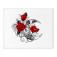 Contour, mechanical crescent moon with gears, decorated with red roses with black spiked stems and leaves on white background. Steampunk