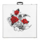 Contour, mechanical crescent moon with gears, decorated with red roses with black spiked stems and leaves on white background. Steampunk