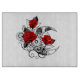 Contour, mechanical crescent moon with gears, decorated with red roses with black spiked stems and leaves on white background. Steampunk