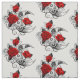 Contour, mechanical crescent moon with gears, decorated with red roses with black spiked stems and leaves on white background. Steampunk