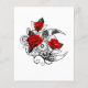 Contour, mechanical crescent moon with gears, decorated with red roses with black spiked stems and leaves on white background. Steampunk