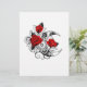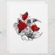 Contour, mechanical crescent moon with gears, decorated with red roses with black spiked stems and leaves on white background. Steampunk