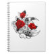 Contour, mechanical crescent moon with gears, decorated with red roses with black spiked stems and leaves on white background. Steampunk