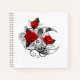 Contour, mechanical crescent moon with gears, decorated with red roses with black spiked stems and leaves on white background. Steampunk
