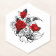 Contour, mechanical crescent moon with gears, decorated with red roses with black spiked stems and leaves on white background. Steampunk