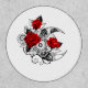 Contour, mechanical crescent moon with gears, decorated with red roses with black spiked stems and leaves on white background. Steampunk