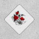 Contour, mechanical crescent moon with gears, decorated with red roses with black spiked stems and leaves on white background. Steampunk