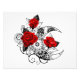 Contour, mechanical crescent moon with gears, decorated with red roses with black spiked stems and leaves on white background. Steampunk