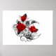 Contour, mechanical crescent moon with gears, decorated with red roses with black spiked stems and leaves on white background. Steampunk