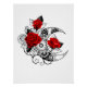 Contour, mechanical crescent moon with gears, decorated with red roses with black spiked stems and leaves on white background. Steampunk