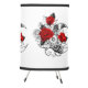 Contour, mechanical crescent moon with gears, decorated with red roses with black spiked stems and leaves on white background. Steampunk