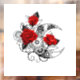Contour, mechanical crescent moon with gears, decorated with red roses with black spiked stems and leaves on white background. Steampunk