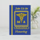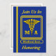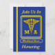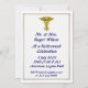 This blue and gold invitation is decorated on the front with the retired Medical Assistant caduceus shield. You can customize this card by placing your information into the boxes provided.