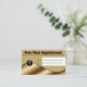 A white wavy banner divides a faux gold and tan colored background that has templates for the date and time your customer / patient has his or her next appointment. Personalize the company name, contact and address details to reflect your corporate information.