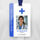 The front of the badge displays the medical facility name, logo, officer photo, officer name, and designation. The layout ensures patient-facing clarity and quick staff recognition.