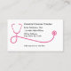 Medical Oncologist theme business cards designed with a pink stethoscope graphic representing the fight for Cancer in a simple editable template for an office of Oncology.