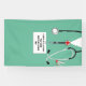 Doctor medical school graduation party banner featuring creative scrubs and Swiss Army knife design. Edit text to add physician's name and medical credentials.