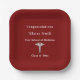 Elegant paper plates with Caduceus, for your medical student graduate. Dark red background can be changed to any color you like. Add your name, university and your year of graduation.