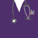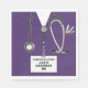 Creative doctor graduation party napkins featuring purple hospital scrubs, a stethoscope, and a Swiss Army knife. Edit text to add doctor, nurse or physician assistant's name.