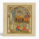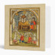 Two apprentices stoke the fire in a medieval laboratory distilling liquids with beakers and retorts, while the master alchemist sits at the table measuring out quantities of minerals on a balance scale. Illuminated manuscript illustration for The Ordinal of Alchemy published in 1477 by Thomas Norton.