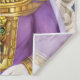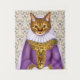 Tapestry in a portrait of a ginger cat, dressed as an aristocratic, medieval cat maiden, in a purple, elaborately trimmed dress, and a veil