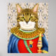 Poster in a portrait of a tiger striped cat, dressed as a medieval prince, in royal robes and an ornate collar, and carrying a scepter