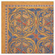 Abstract geometric design featuring detail from medieval Armenian illuminated manuscript in gold, red and blue