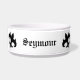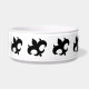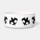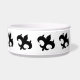 Tilted black royal gothic medieval fleur de lis symbols surround a dog food bowl. Add your dog's name to it.