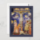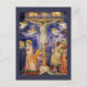 Medieval Good Friday scene with Christ on the Cross surrounded by angels. Richly colored in blues, golden yellows and orange.