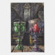 Medieval pair of green and red goblets with silver lead trim in medieval gothic castle library.