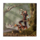 The mists clear upon a scene in a dense forest. Along the rocky banks of a winding stream, moss covered oaks grow twisted and thick. A woman wearing a black outfit with white fur trim carries a spear and is accompanies by a pair of hunting dogs. Sighting her quarry, the huntress sounds a recheat on her horn to send her hounds into action.