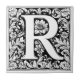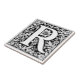 A black and white vector illustration of the letter in an elaborate medieval style, created in the style of Albrecht Dürer. The design is a square with a large central floral motif surrounded by symmetrical geometric patterns and swirls.