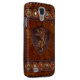 Image of medieval leather book cover with a rampant lion within the shape of a shield.