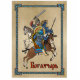 A depiction of a battle between a Russian bogatyr and an Asiatic warrior, both on horseback, superimposed on an old paper, or parchment, background image. Cyrillic (Russian) text reading "Богатырь"(Bogatyr) also appears.