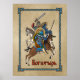 A depiction of a battle between a Russian bogatyr and an Asiatic warrior, both on horseback. Cyrillic (Russian) text reading "Богатырь"(Bogatyr) also appears. Bogatyri are heroic characters found in medieval Slavic epics. They are akin to the knights-errant of Western literature. Most of the stories about bogatyri revolve around the court of Vladimir I of Kiev (958–1015). Some bogatyri are presumed to be historical figures. Bogatyri protected Russian land and people against invaders, especially Tatars. Some were attributed powers and strength which were almost divine. This image is adapted from a black and white line drawing illustration in "Повесть о славных богатырях, златом граде Киеве и великой напасти на землю Русскую" (A Tale of Glorious Heroes From the Golden City Kiev and the Great Scourging of the Russian Land) by Tamara Likhiotal; published in the USSR in 1974.